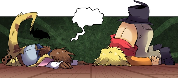 Rhea and Jake later returned to the wagon and were in a severe hangover. Rhea tried her best to remember what had happened that resulted in the tip of her tail being burnt. She remembers there being a fire, screaming and very upset guards; which she concluded was normal when going out drinking with Jake.
