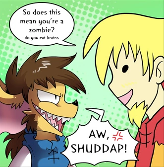 He then started to question about her murder, as it was mentioned in Ramirez's letter.[14] Rhea attempted to deny it again at first, but Jake was able to trick her into admitting it through the fact that Buwaro and Kieri were really a Demon and Angel. After she showed him the scar she received from being stabbed, Jake initially tried to be sympathetic but got sidetracked by the idea that Rhea could qualify as a zombie now, and made a joke about asking her if she "eats brains" instead.[15] Rhea noted that Jake was being quite accepting of everything she said, which he dismissed as it being simply easier to believe her since there's a lot of "rumors going 'round" anyway.[16]