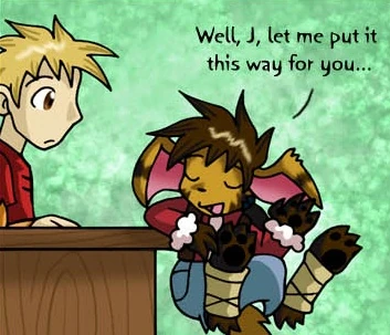 One evening, as everyone was eating soup, J noticed it tasted strange and saw that it had been poisoned with Heartbreak Fruit, which caused everyone to act strange and enamored. When Rhea recalled something about "love potions" that happened in the past, J teased in return that "this time" she'd join them on the trip. They then started acting oddly flirtatious with Kieri while asking her to watch out for everyone's safety, before getting into a fight with Rhea and Kazai. The next morning, when Rhea woke up with a changed tail, they prompted her to tell the truth about why it happened.