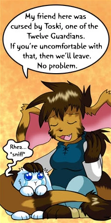 The next day, she saw with surprise that Rhea's tail had changed, prompting Rhea to explain everything that she learned about Death being Darius and Moku being her grandfather. The weight of such information made her collapse to the ground; however, she comforted Rhea by pointing out they now both had "funky transformation stuff going on". When Kazai admitted to having spiked the soup and Buwaro forgave him easily, she sighed. Later that day, as Kazai appeared dismissive of Kieri's ease in controlling her curse, claiming his Star Pendant to be the reason, she gave him the cold, silent treatment and ignored his attempts at bonding, prompting him to cry.