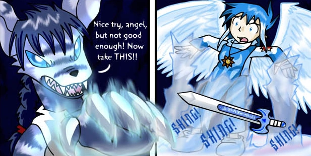 However, the old Angel was still bent on attacking them, to get rid of Demons and “traitors” like her. Cliff's intervention eventually saved them; he revealed the Angel to be a Denevol, and fought him using powerful Magic which scared Kieri, as she recognized his spell as that of Siara the Lynx. Miranda was able to save Buwaro with her healing potion, and they returned to the wagon.