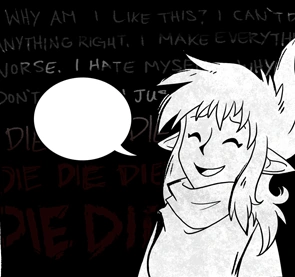 Later that night, "Snowy" had a nightmare about Lazuli killing her before awaking in her Angel form right next to Buwaro and Rhea, who were still sleeping. She fell out of bed and woke up Buwaro, who was half-awake and didn't know what to make of this. She made her way out of the room and got a hold of a knife to defend herself with. She thought to herself about where she could be and what she could do given her situation. Suddenly Buwaro surprised her, turning her back into her rabbit form. Soon Rhea came into the room, wondering what was going on, and tried to calm "Snowy" down. The rabbit didn't cooperate, prompting Rhea to get more hands-on, which made Snowy turn back into her Angel form.
