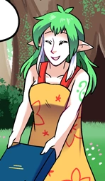 During the third day of the Flower Festival, by Lakritz’s advice, she decided to wear a different outfit. She wore an orange-sleeveless dress with flower patterns (both large and small) covered all over, held up by red straps over her shoulders and a red sash around her waist. She also has a brown bag that hangs across from her left shoulder down to the right side of her waist.