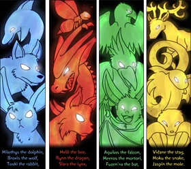 The Twelve Guardians are ageless sentient animals with vast magical power. Each guardian has a natural animal form but also possesses the ability to shape-shift into a mortal form (Human, Jakkai, Fairy, Khamega, etc) as a disguise to walk amongst mortals without attracting attention; however, in both their natural and disguise forms, the symbol of their magical element is displayed visibly somewhere on their body.