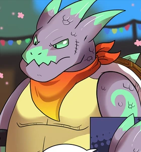 He appears to be about the average size of any Khamega. His scales are mostly purple with light-green scales on the tip of his ears and nose and form swirl patterns on his forearms and legs. His shell is brown with light-green spikes running up the middle, and there are also two spikes at the end of his tail. He has a small scar on the left side of his face with stitch marks under his eye; his eyes are light-green. He wears an orange bandanna around his neck which is faded to yellow at the end, and two black spiked-wristbands.