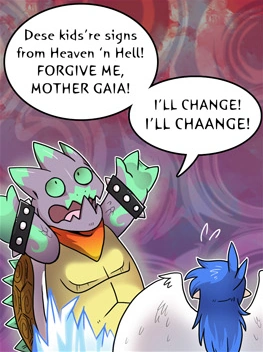 He discovered his mistake almost instantly, Kieri entered her combat 'mode' and froze him in place with her magic before drawing her sword and revealing her wings.[4] She approached and shouted at him in Angelic whilst threatening him with her sword. This combination of factors made it obvious that she was a real Angel and his tough demeanour evaporated; he surrendered Crunky without any resistance. He then started praying to Mother Gaia to forgive him, declaring that he would change his ways, before running off in fear.[2]